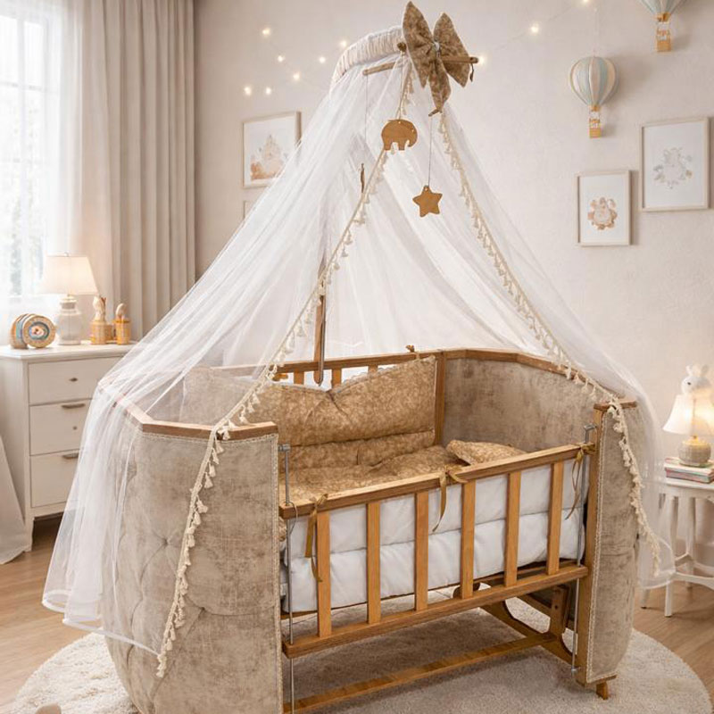 تخت و گهواره الیت لمسه با ابعاد ۷۰در ۱۲۵سانتی متر ارتفاع ۹۰سانتی بدون سایه بان ارتفاع ۱۶۵ سانتی متر با سایه بان دیزاین شده با لمسه های دست دوز مکانیزم آسانسوری رنگبندی:طوسی/کرم